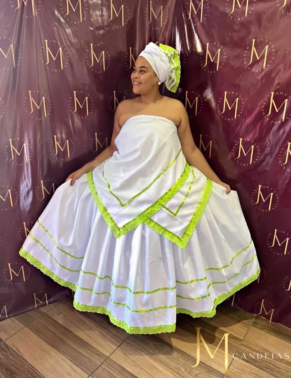 Conjunto tradicional de baiana na vibrante cor verde limão, confeccionado em tecido Oxford, ideal para rituais religiosos, saídas de santo, festas litúrgicas e homenagens às orixás.
